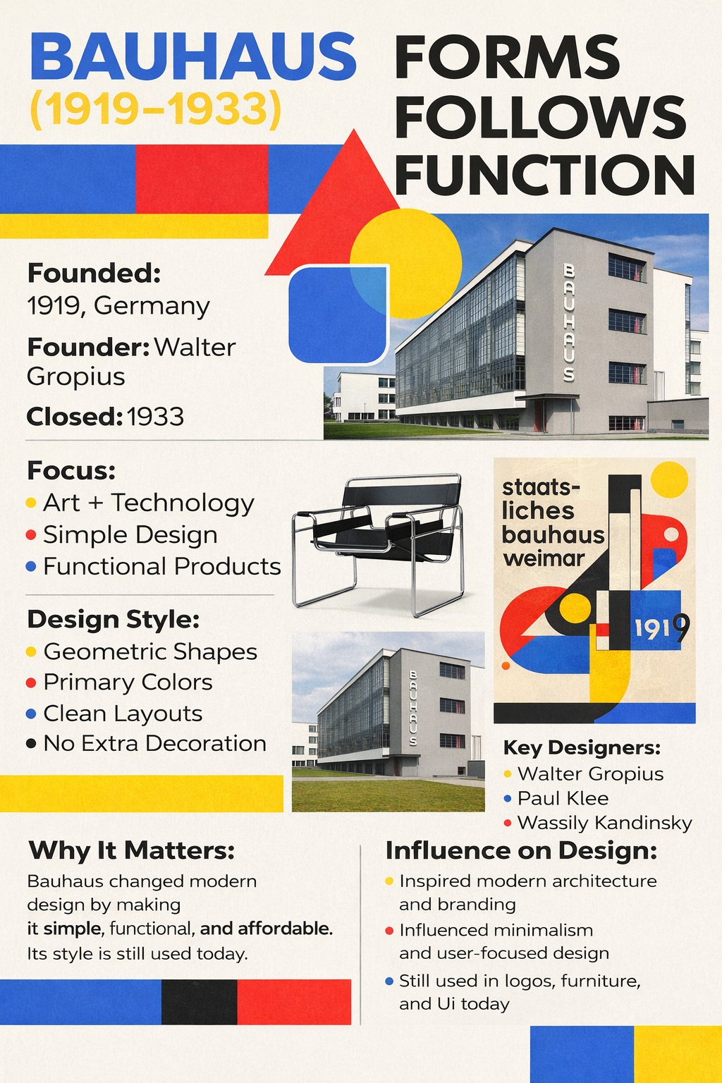 This infographic aims to demonstrate how historical design principles, like those from the Bauhaus movement, still influence modern creative work. It's designed for fellow designers, students, and anyone interested in the foundational elements of graphic design.